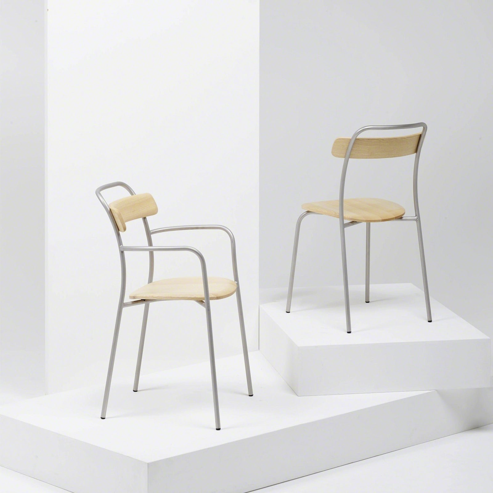 Forcina translates as hairpin. The frame reaches beyond the backrest and — like the hairpin — provides an easy place to grasp the chair. The collection includes chairs. armchairs. tables. stools.